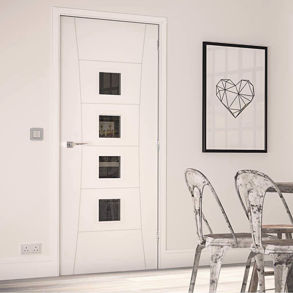 Sleek glazed white primed flush door with elegant curves from Deanta Collection. Modern contemporary design with clear safety glass. Ready for final paint coat.