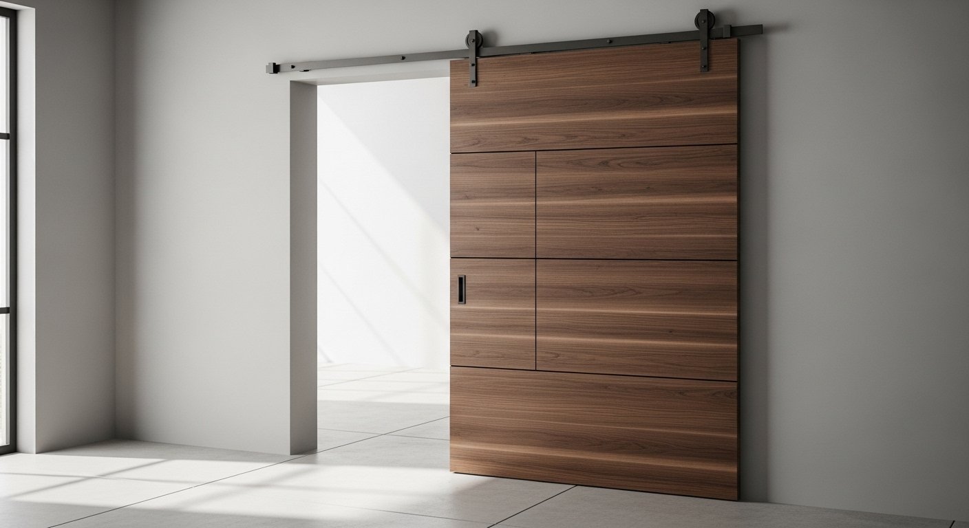 Solid wooden sliding door with 6mm 61x95cm and 61x61cm frosted/clear glass panel finished in veneer and stained to client approved color. Includesframes, architraves only. – Supply and install in quality finish.